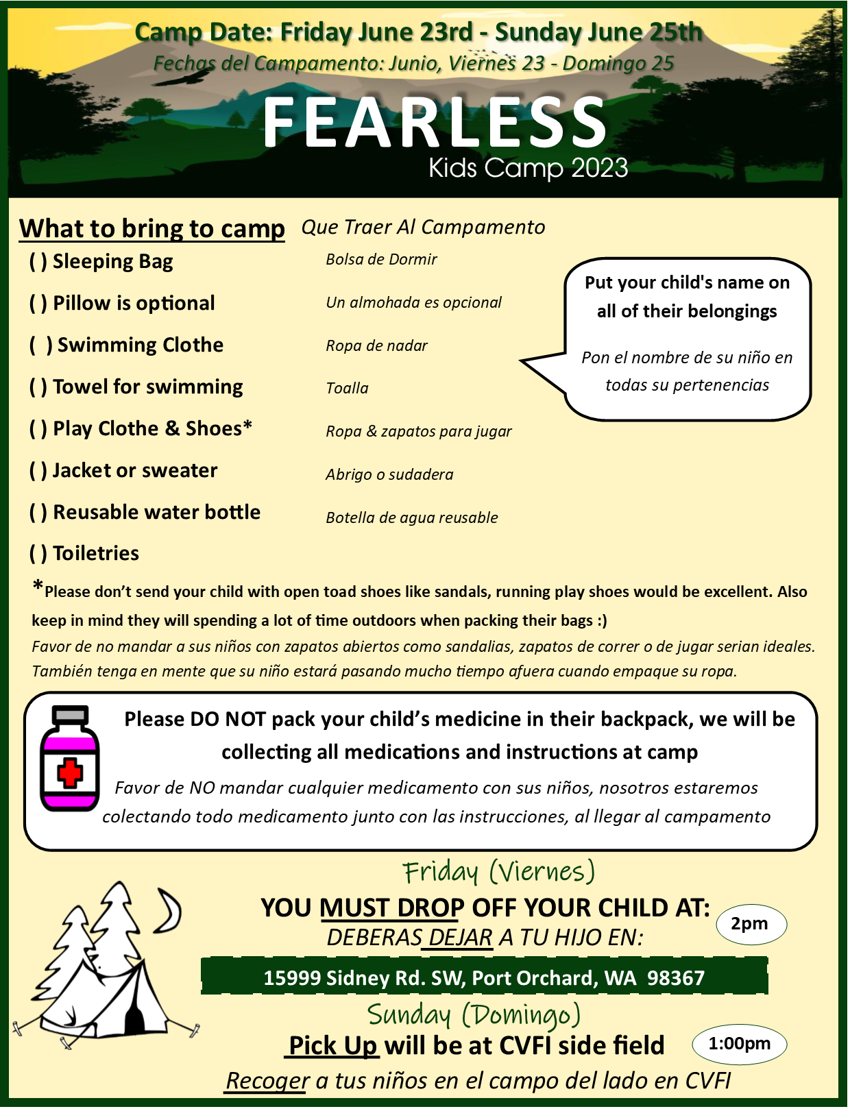 Te invitamos a pasar 3 increíbles días de diversión al aire libre! Únase a nosotros del 23 al 25 de junio en Miracle Ranch en Port Orchard. Tendremos natación, competencias en equipo, s'mores junto al fuego, noche de película al aire libre y mensajes que nos llevaran a experimentar a Jesús como nunca antes.